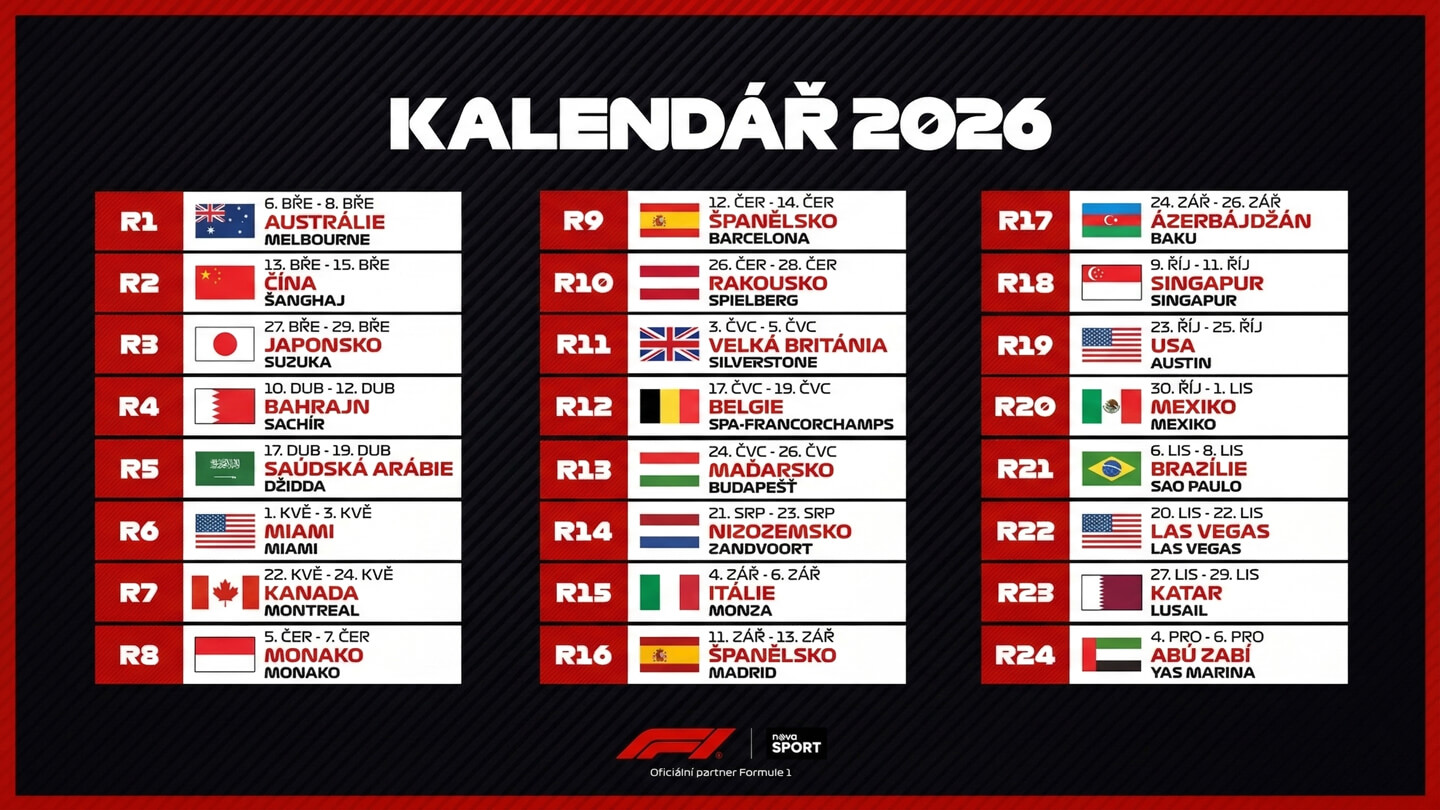 Jaký má Formule 1 program pro rok 2026? Tuto sezónu uvidíme opět 24 velkých cen. Sezóna potrvá od března do prosince, kdy už tradičně skončí Velkou cenou Spojených arabských emirátů na okruhu Yas Marina.