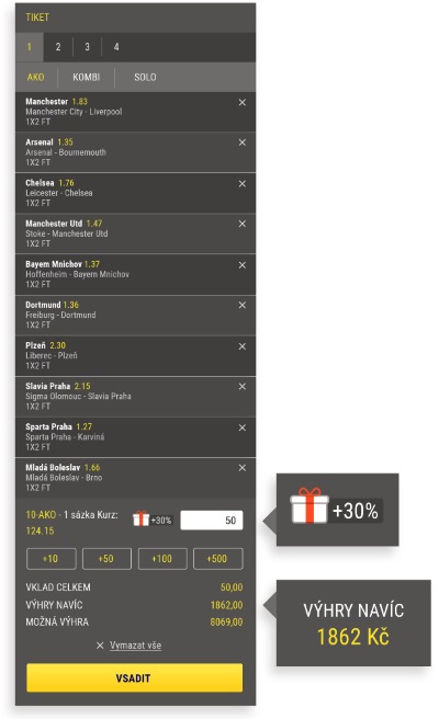 Jedná se o výrazné oživení českého trhu kurzových sázek. Žádná jiná sázková kancelář tento typ bonusu nenabízí. Princip je velmi jednoduchý – čím více zápasů na tiketu, tím větší navýšení výhry.